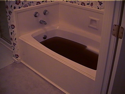 In this photo you can see the water in this bathtub is very rusty. It is a good sign the water heater is rusted out and or the water supply piping is rusting. This condition shows up more when a house has set vacant for some time.