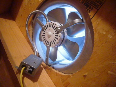 view of a power attic ventilator shows the wiring is exposed